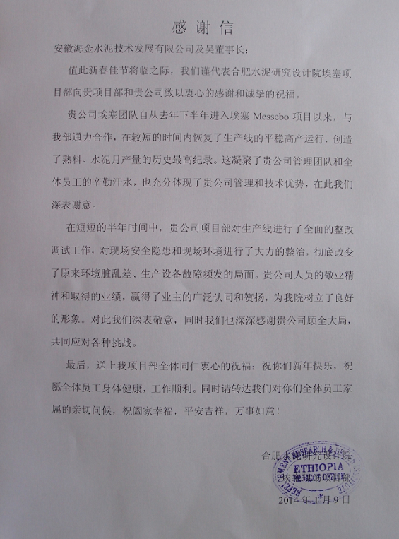 合肥水泥研究設計院埃塞項目部致海金公司的感謝信